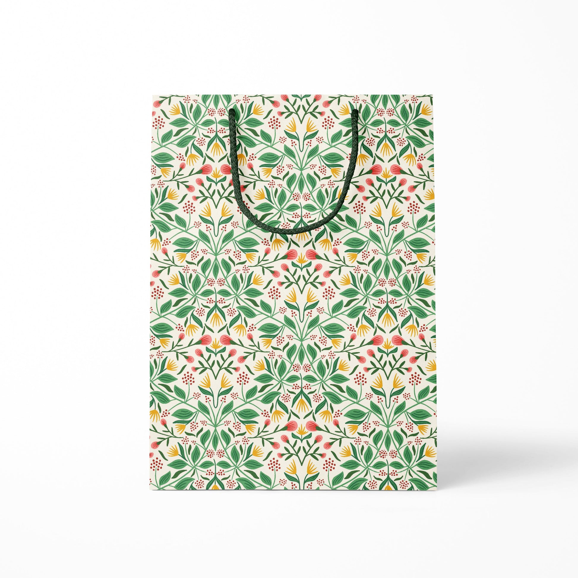 Introducing the Camden Bloom Gift Bag, a splendid blend of modern style and timeless appeal. Featuring an elegant geometric floral pattern with pink buds and yellow flowers on a cream background, this bag is complemented by green-lined patterns on the gusseted sides. Perfect for any celebration, the Camden Bloom bag makes each present a standout expression of sophistication.