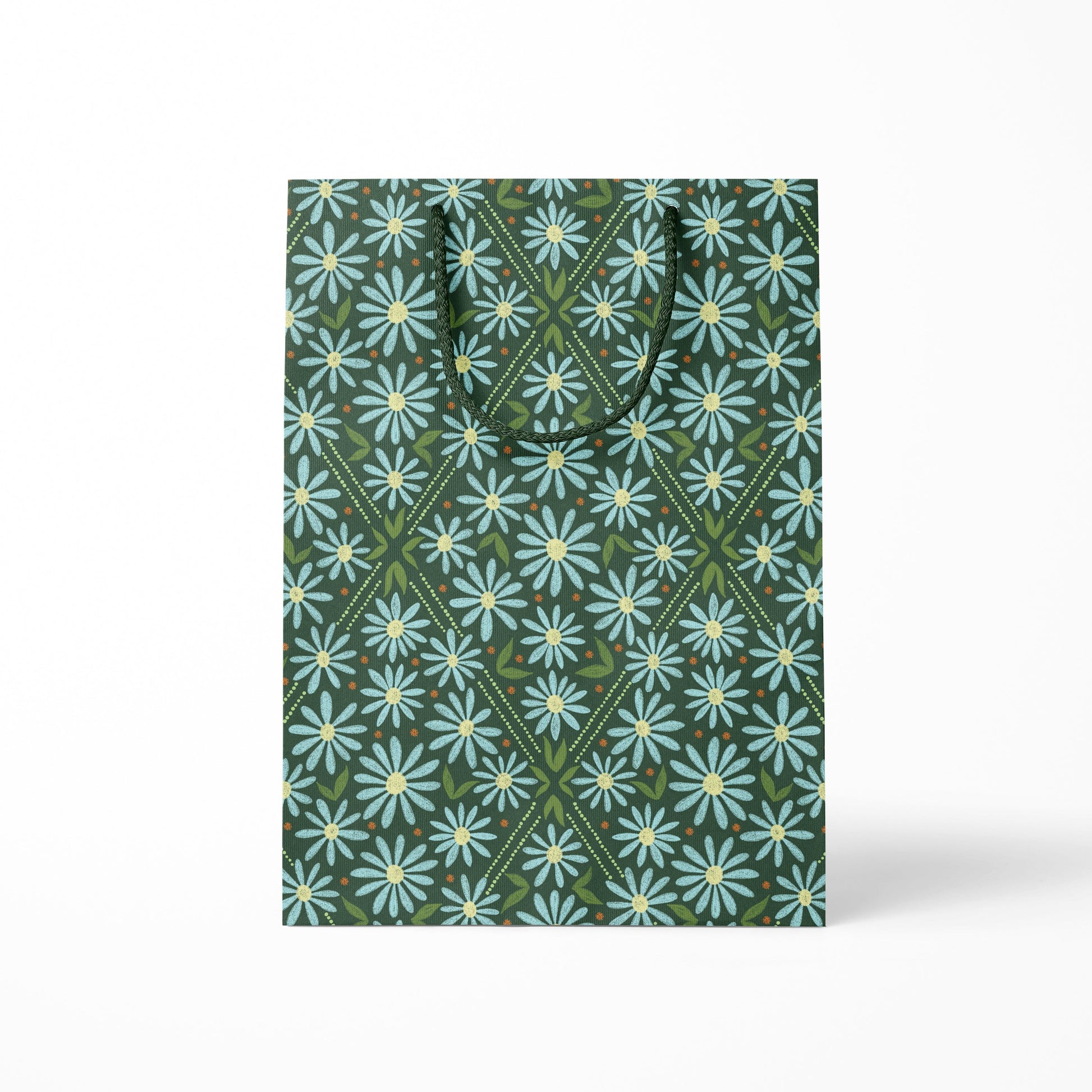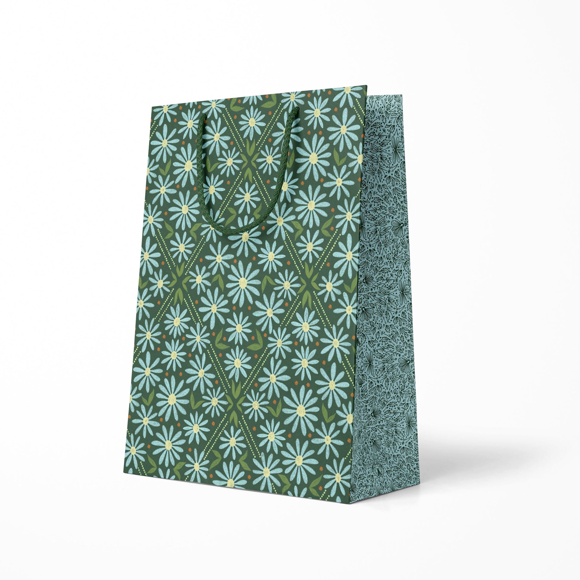 Introducing the Daisy Field Gift Bag, a delightful fusion of design and functionality. Featuring a whimsical pattern of blue flowers on a deep green background, this bag is accented with dark green braided rope handles and nature-inspired patterns on the gusseted sides. Perfect for any occasion, the Daisy Field bag transforms every gift into a vibrant celebration of nature's beauty.