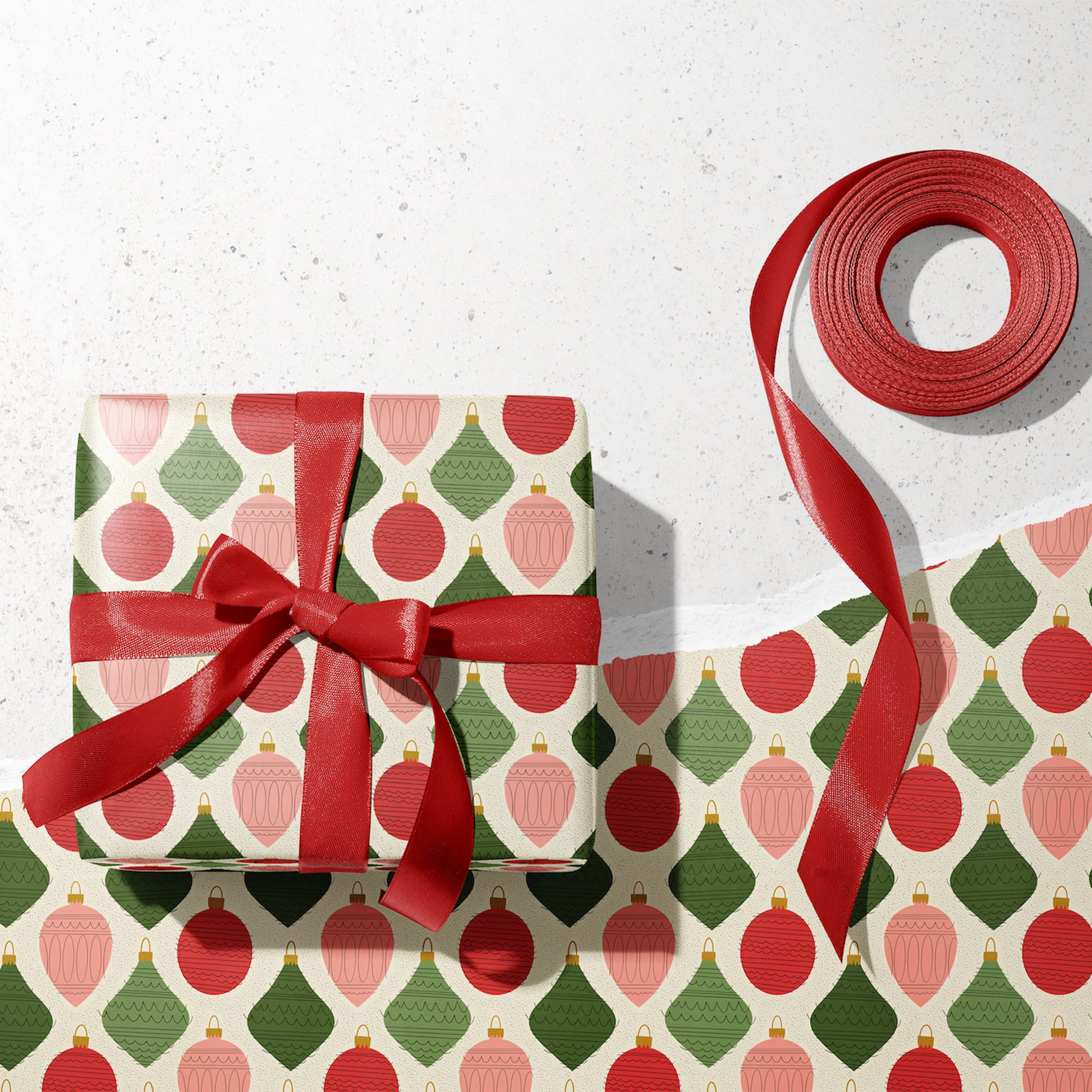Make your gifts festive with Deck The Halls Wrapping Paper. A nostalgic pattern of vintage ornaments in pink, red, and green on a cream background. Perfect for holiday gift wrapping.