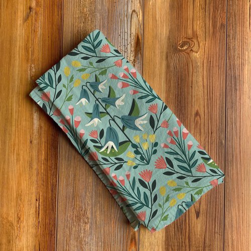 Bright, cheerful florals pop against a soft light blue background, creating a joyful, garden-inspired design. Great for everyday kitchen tasks, hanging as decor, or a charming addition to any gift basket to a floral lover.