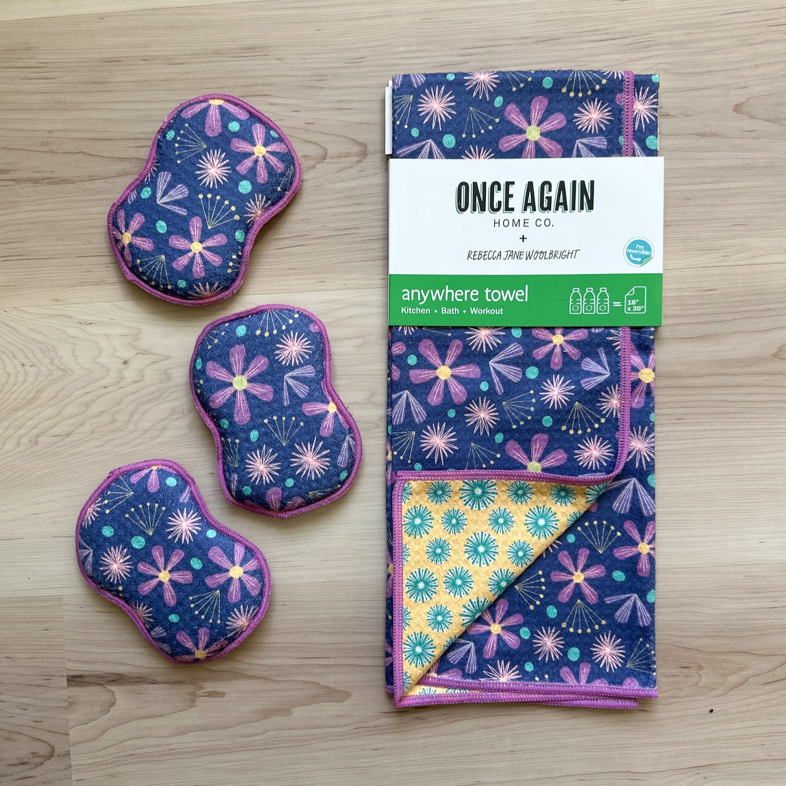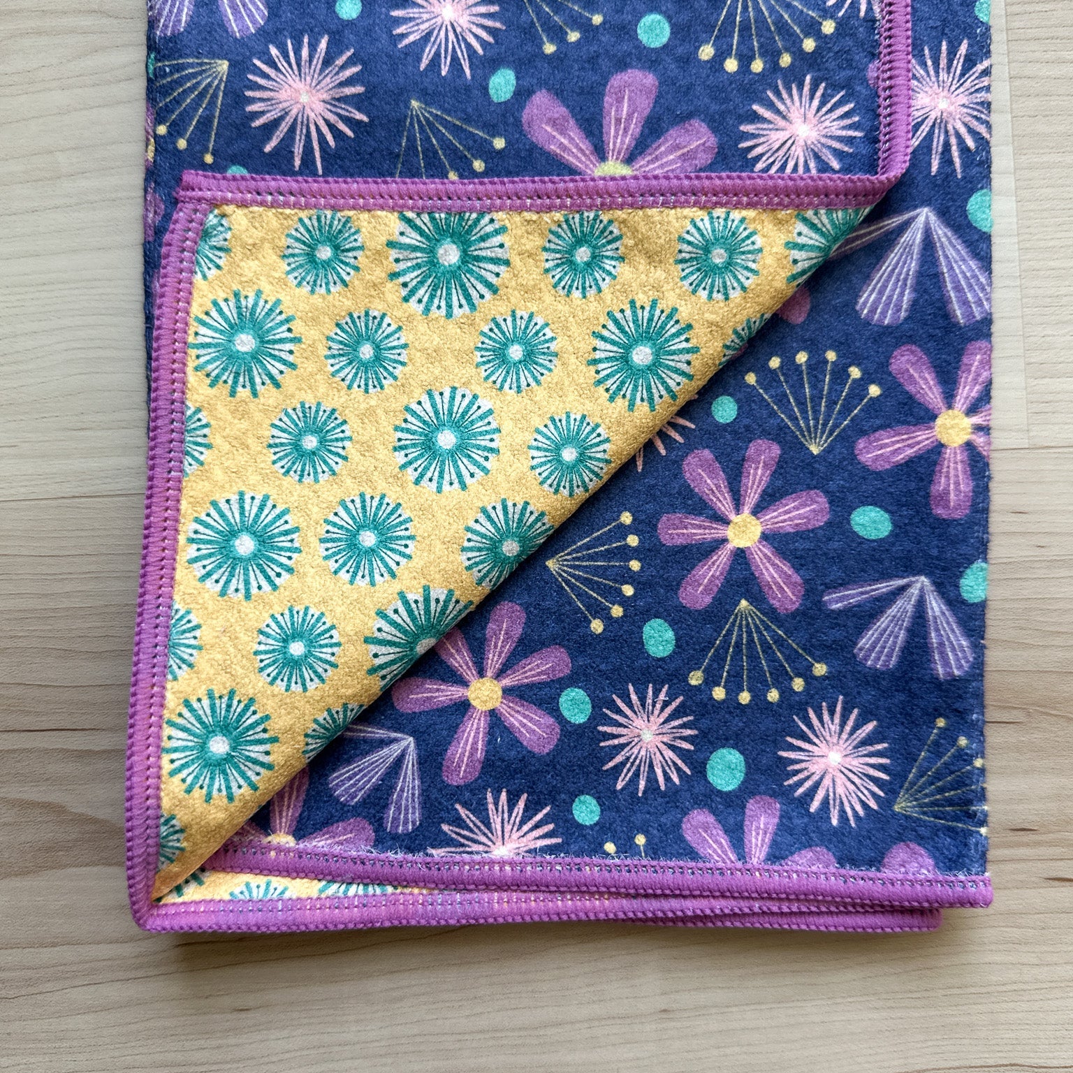 Experience a fun and quirky mix of playful violets and sunny yellows, as this towel brings a delightful floral dance to any space! Whether in the kitchen, bathroom, or gym, this reversible towel is both stylish and sustainable, making it a perfect blend of beauty and functionality.