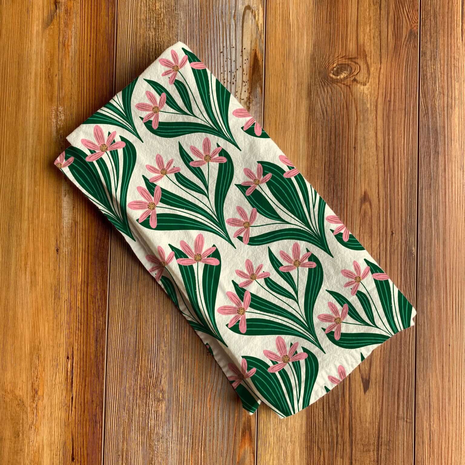 A charming pattern of pink flowers and green leaves creates a soft, feminine touch for any space. Ideal for everyday kitchen tasks, adding a fresh accent to your decor, or A perfect present for to a floral enthusiast.