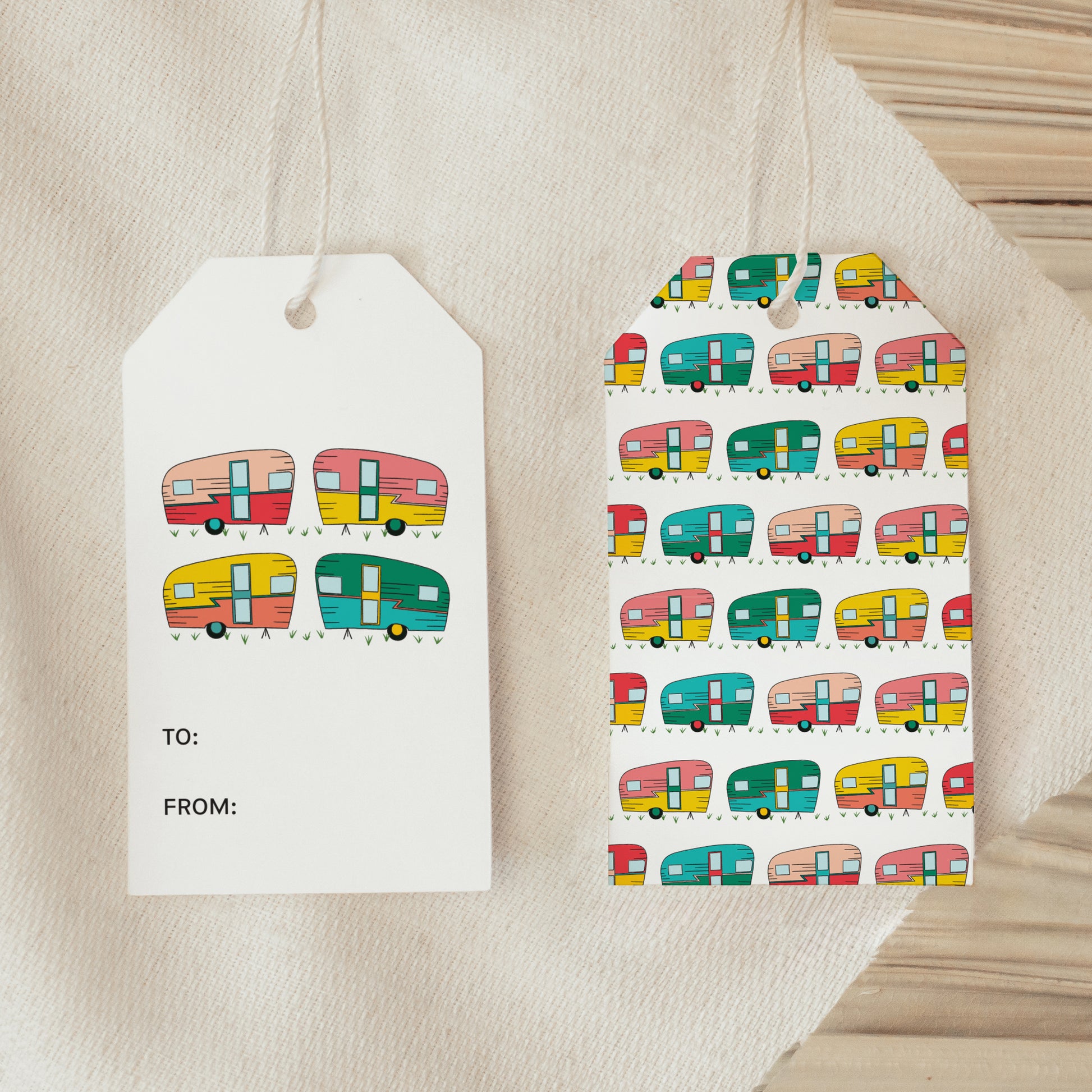 Transform your travel-themed gifts with these retro camper and road trip gift tags in cheerful colors. Great for adventure lovers, going away parties, retirement gifts, or vacation souvenirs.
