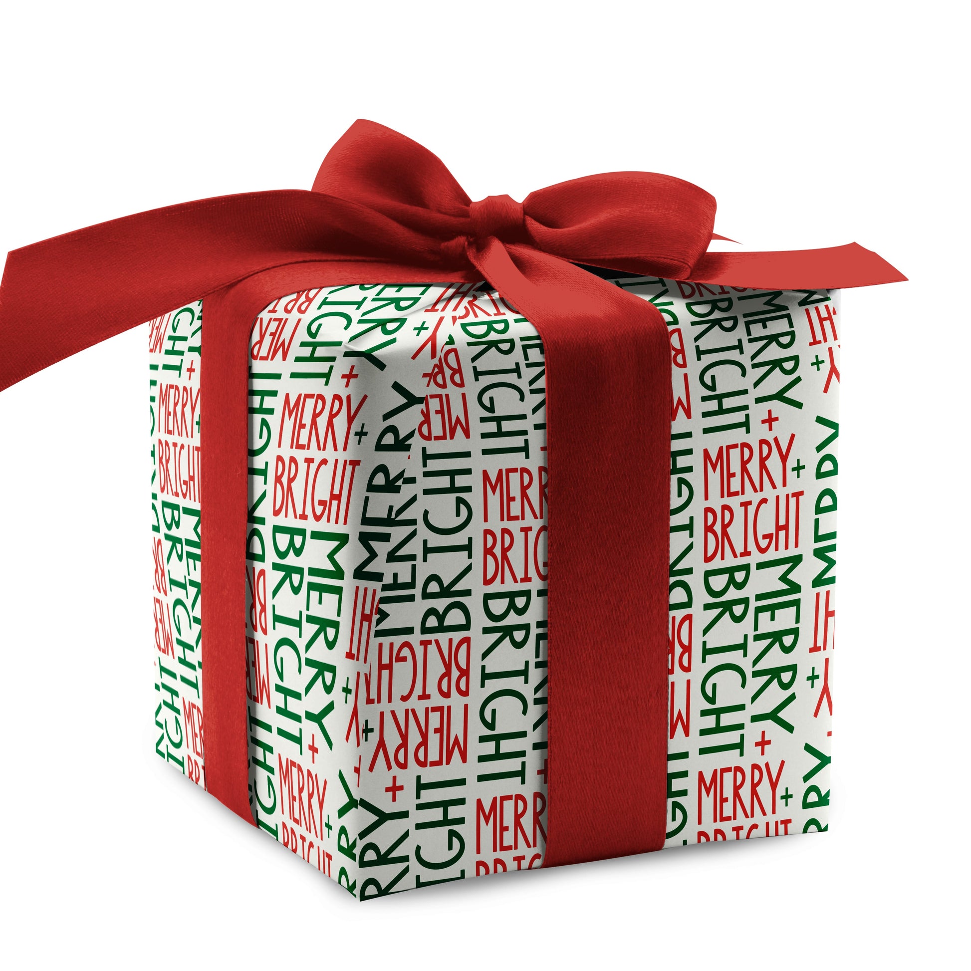 Make your gifts stand out with Merry + Bright Wrapping Paper. A festive repeat of the phrase 'Merry & Bright' in red and green on an off-white background. A cheerful choice for holiday gift wrapping.