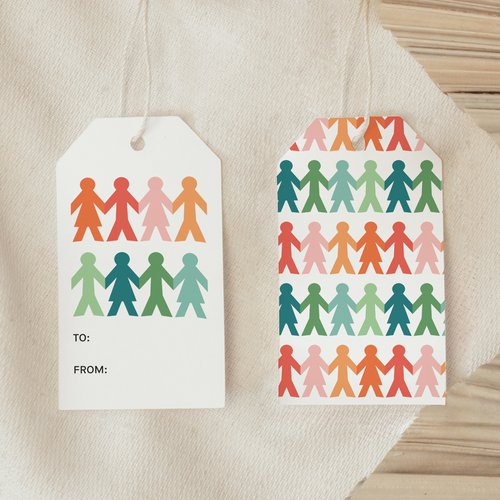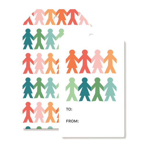 Celebrate togetherness and joy with the Paper Friends Gift Tags! Featuring four cut-out paper people holding hands in fun, vibrant colors, this tag is a heartwarming symbol of unity and friendship. Flip it over to reveal a coordinating repeat pattern, adding an extra layer of festivity to every gift.