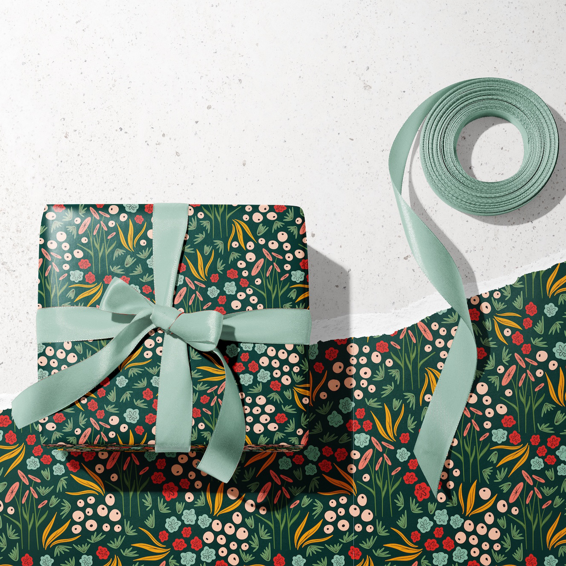 Celebrate in style with Pirouette Wrapping Paper. A floral repeat on a green background, a best-seller year-round. Elegant and timeless for any special occasion.