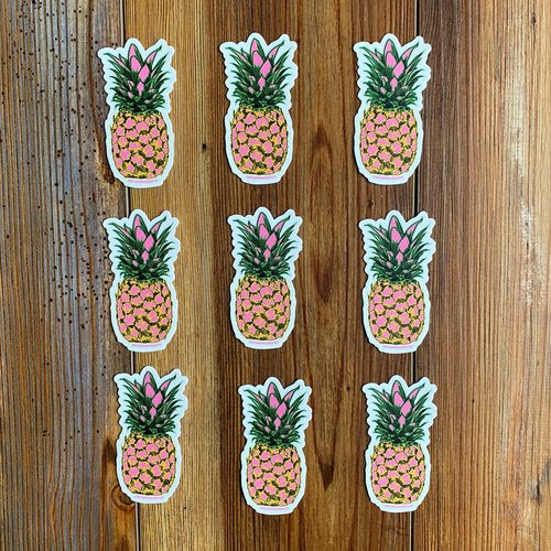 Embrace tropical vibes with the Poppin' Pineapple Vinyl Sticker—a bright and playful take on a summer favorite! This hand-drawn pineapple features fun line details, painted in vibrant shades of pink and yellow, topped with a lush green crown, bringing a sunny slice of paradise wherever you go.