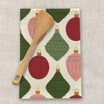 Vintage-inspired pink, red, and green ornaments create a nostalgic holiday design on a soft cream background. Perfect for drying dishes, decorating for the season, or a charming addition to any gift basket to someone who loves classic holiday decor.
