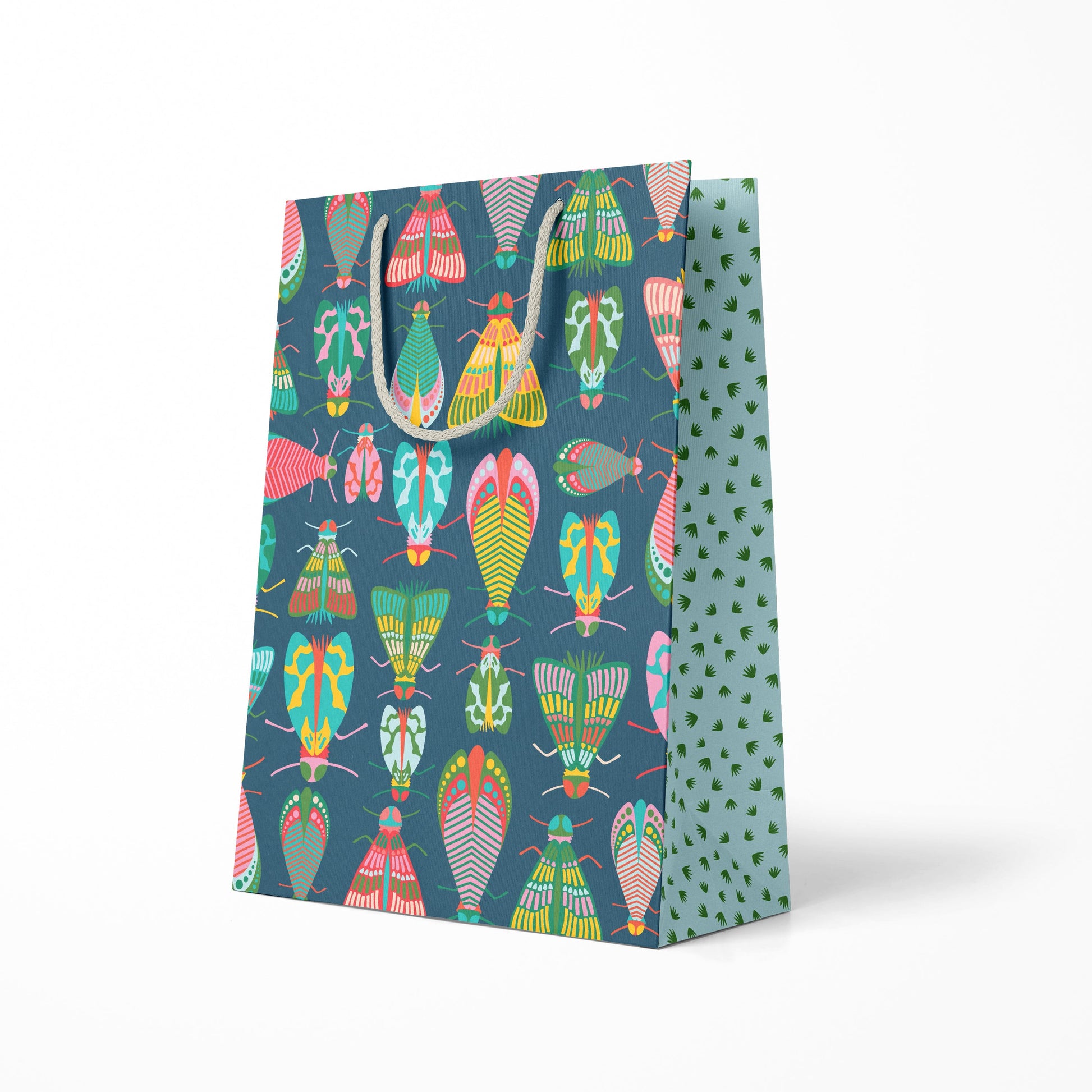 Introducing the Spring Fever Gift Bag, a delightful celebration of the vibrant energy of spring. This bestselling design bursts with colorful bugs on a vivid blue background, capturing the essence of the season. A sleek silver rope handle adds elegance, while the gusseted sides feature light blue and green florals, making it perfect for springtime gifting.