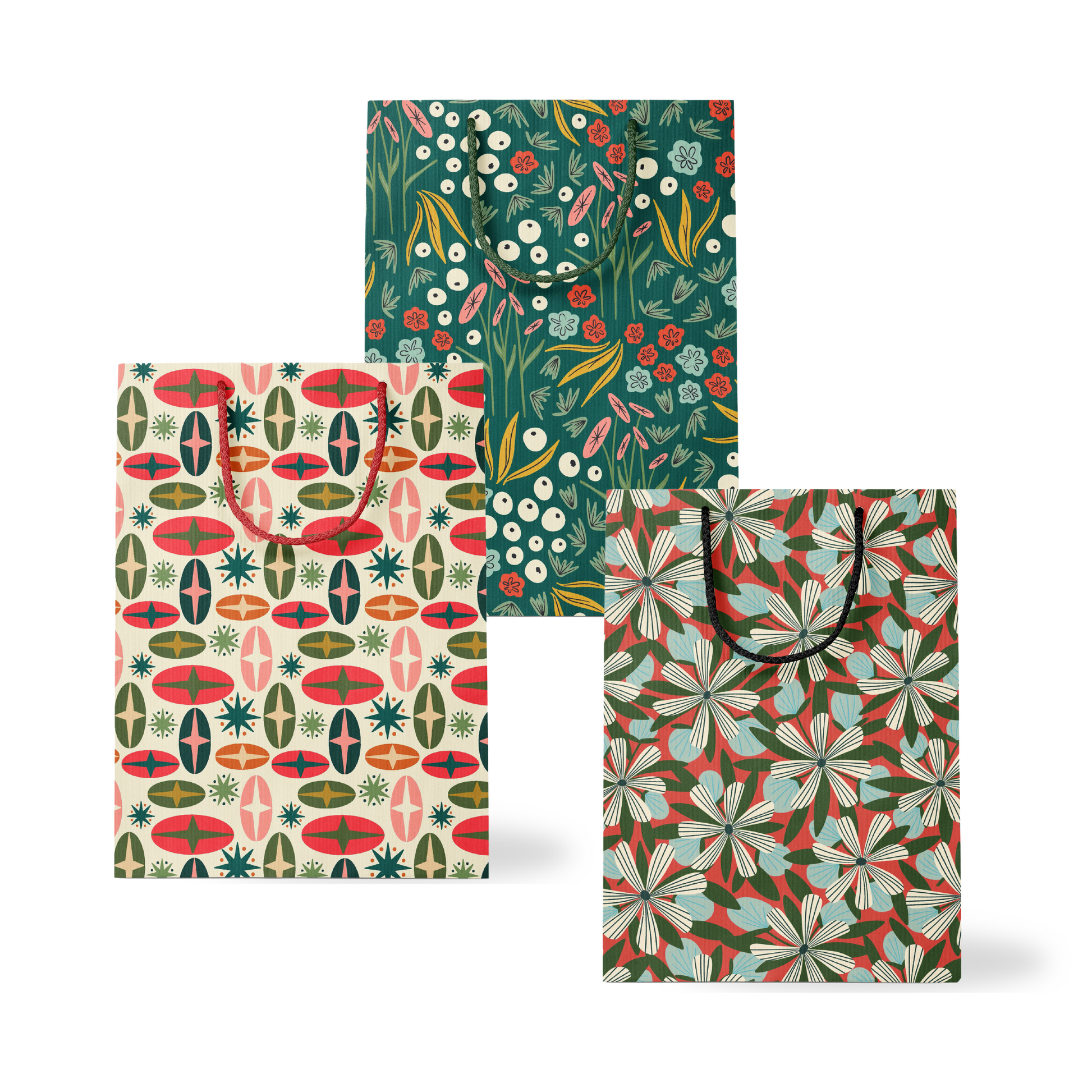 Introducing the Take A Holiday Gift Bag, a vibrant blend of design and elegance. Featuring a lively white floral pattern on a vivid red background, this bag brings a festive touch to any occasion. Black braided rope handles add a sleek contrast, while the gusseted sides showcase a coordinating geometric pattern. Perfect for holiday gifting or any special moment, the Take A Holiday bag transforms every present into a memorable surprise.