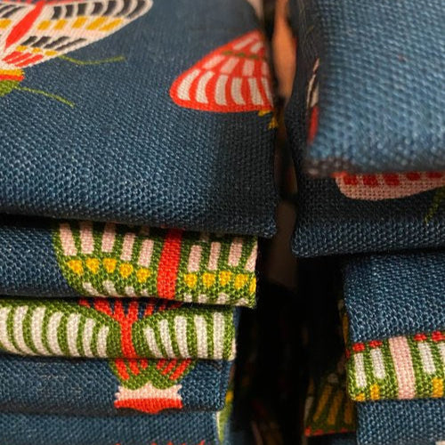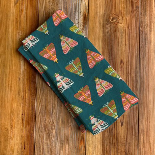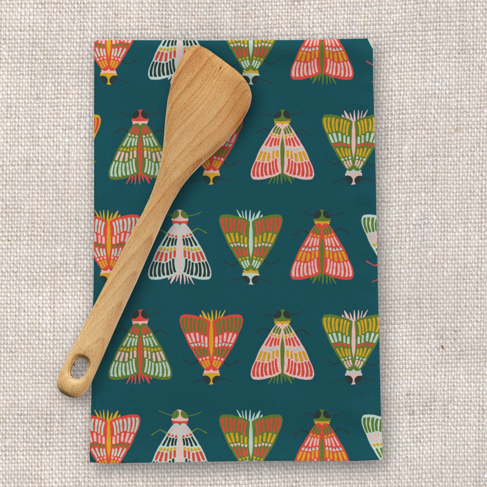 Vibrant hand-drawn moths glow against a deep blue background, creating a bold and enchanting design. Perfect for drying dishes, adding an artistic accent to your kitchen, or perfect for holiday or housewarming gifts to a nature lover.
