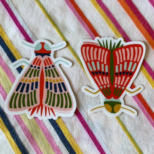 - Big Red Sticker: A striking moth set against a vibrant red backdrop, bursting with colorful wings and eye-catching contrast.