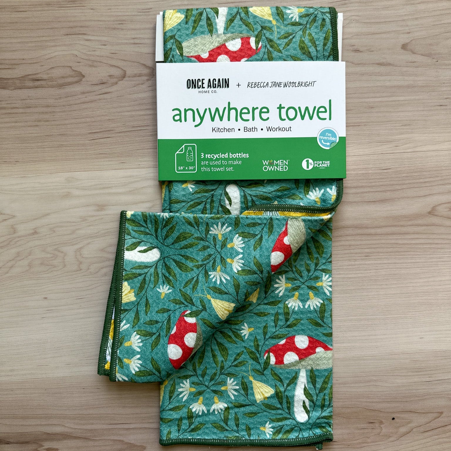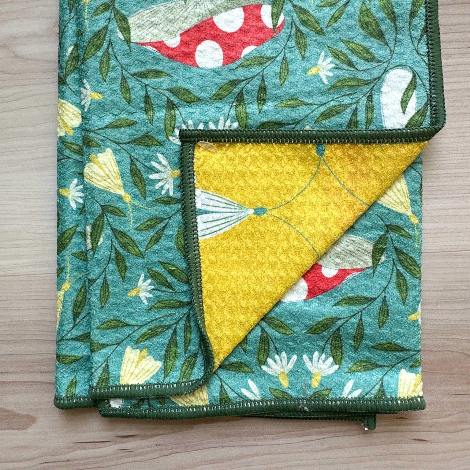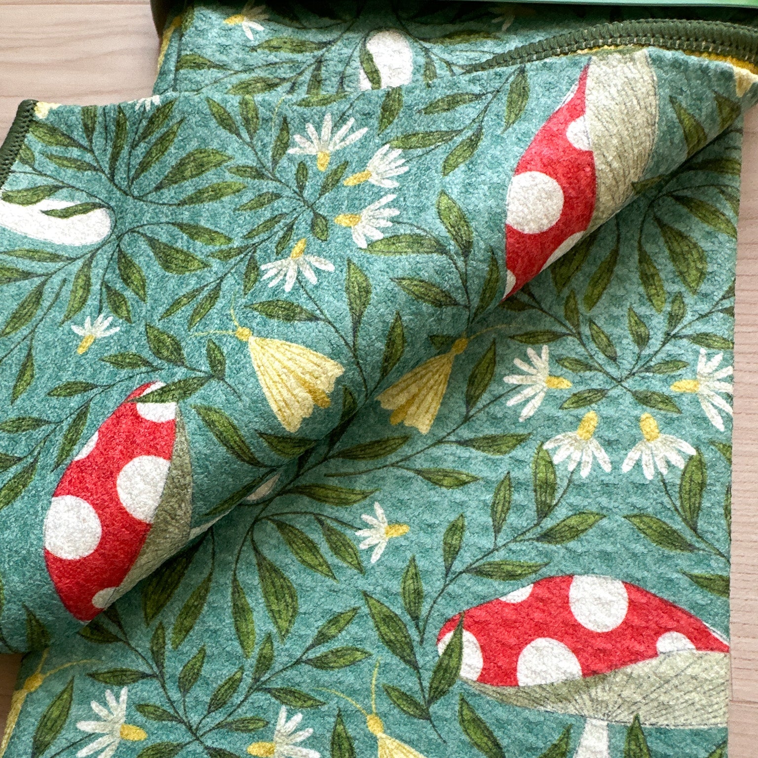 Step into a whimsical world of mushrooms, nestled in a lush green garden with a joyful twist! This reversible towel brings a playful and nature-inspired charm to your kitchen, bathroom, or workout routine—combining sustainability with delightful design.